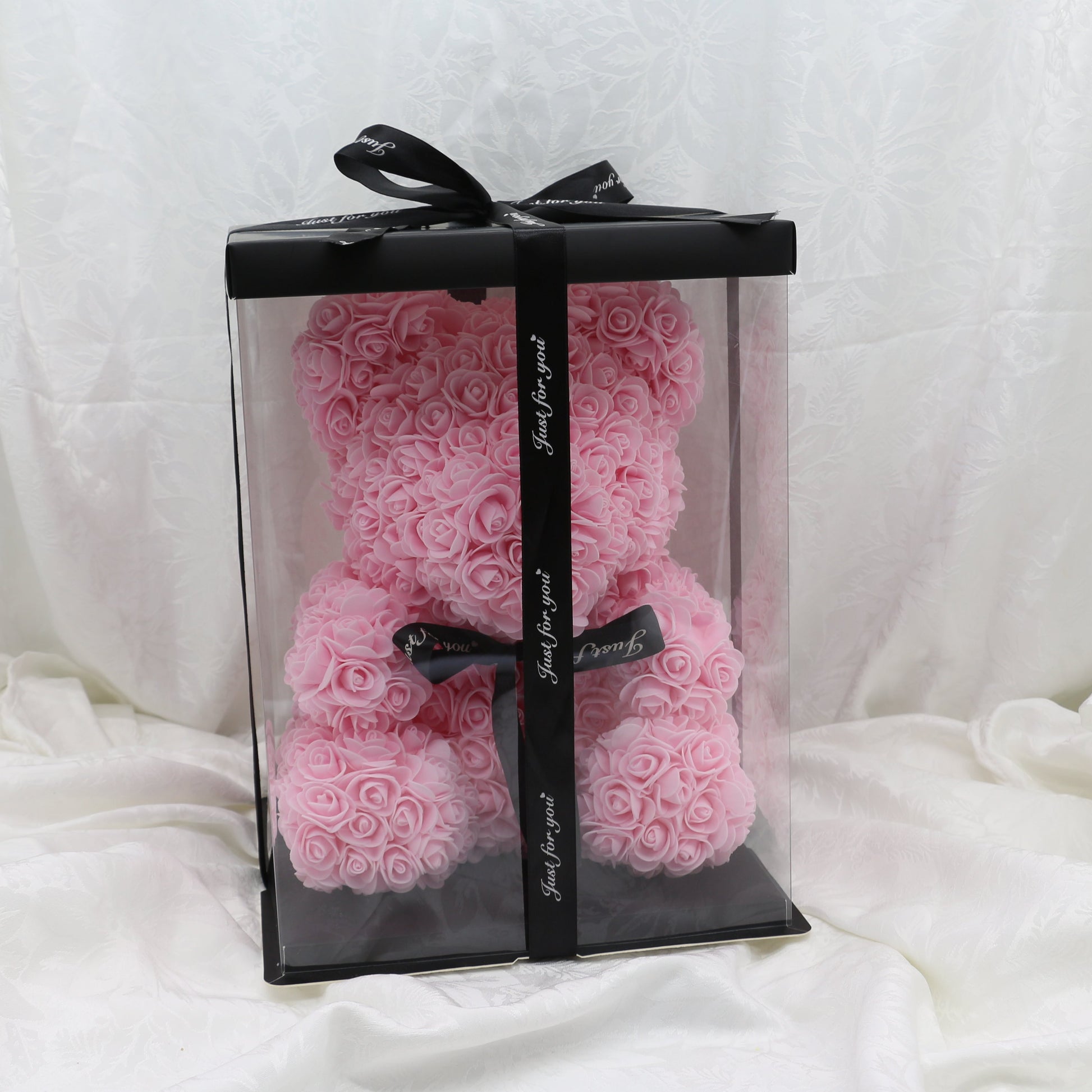 Our Glowing Rose Bears are a timeless and heartfelt gift, perfect for birthdays, anniversaries, weddings, and more. Crafted from PE foam roses and Styrofoam, they symbolize everlasting love. Each 40cm bear is beautifully displayed in a clear box with black accents, preserving glowing memories for years to come.